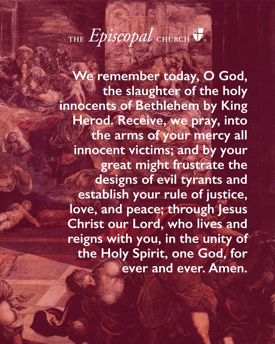 We remember today, O God, the slaughter of the holy innocents of Bethlehem by King Herod. Receive, we pray, into the arms of your mercy all innocent victims; and by your great might frustrate the designs of evil tyrants and establish your rule of justice, love, and peace; through Jesus Christ our Lord, who lives and reigns with you, in the unity of the Holy Spirit, one God, for ever and ever. Amen.